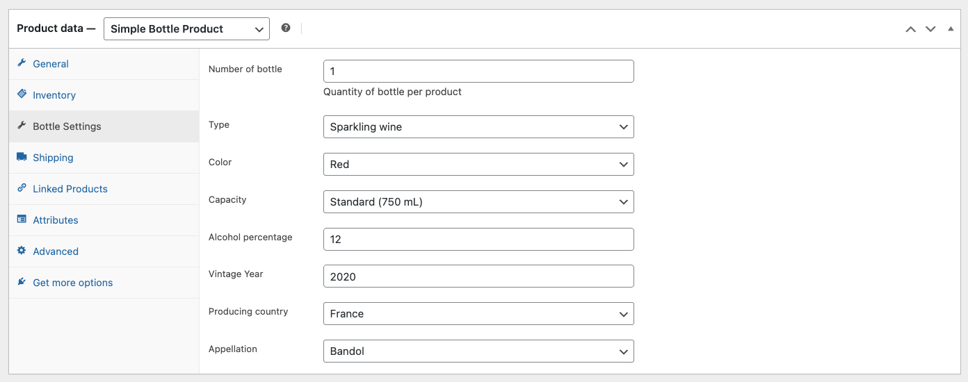 En la sección principal, vaya a la pestaña «Configuración del producto de botella» y marque/rellene los campos obligatorios.