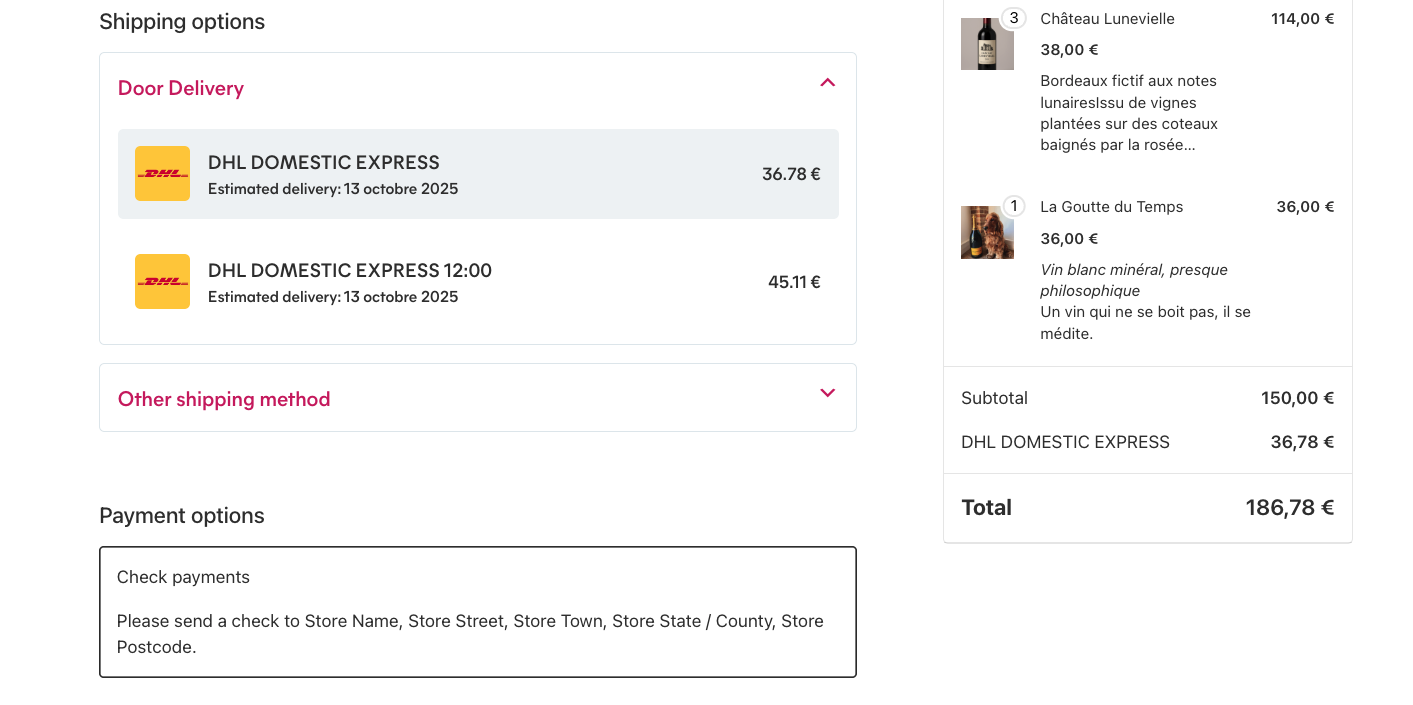 Una vez validada, la dirección de su punto de recogida debería aparecer en la sección derecha de la página (Gutenberg/Bloques) o en la tarifa de envío (clásica)