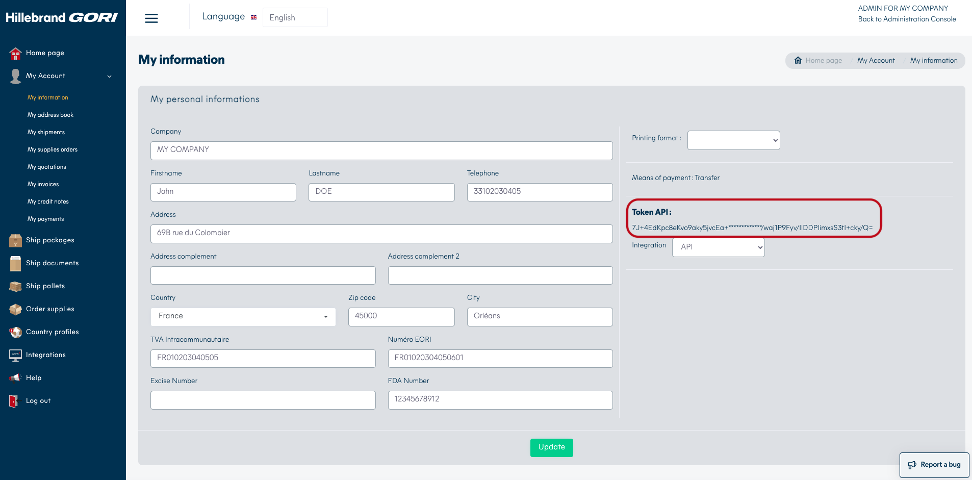 En la página de su cuenta de nuestra extranet puede recuperar su token API