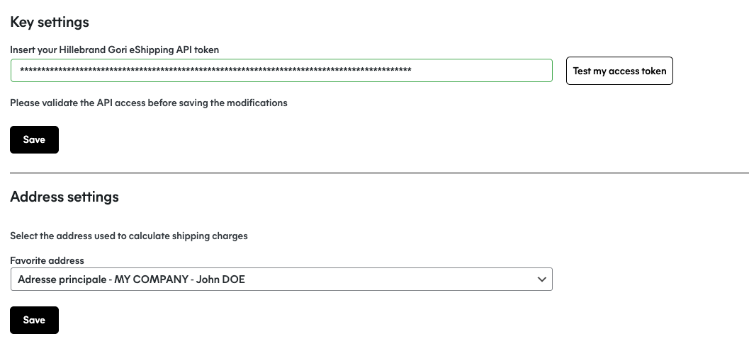 Después de guardar su token válido, debe seleccionar su dirección de recogida y guardarla: